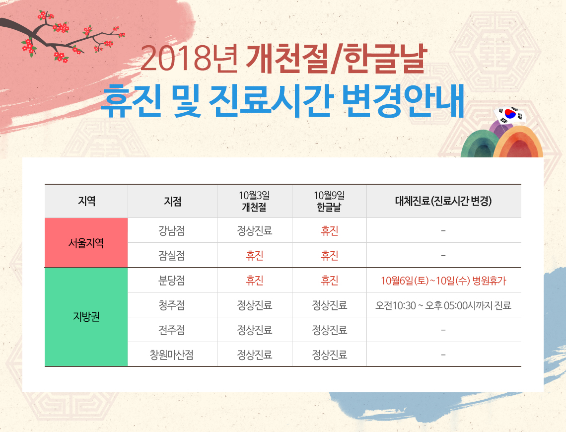 2018 피브로한의원 10월(개천절/한글날) 휴진 및 진료시간 변경안내