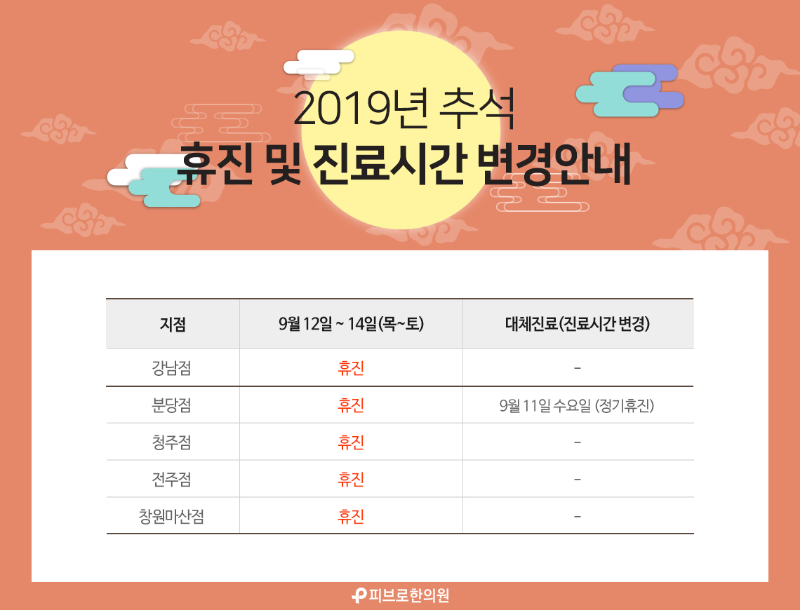 2019 피브로한의원 10월(개천절/한글날) 휴진 및 진료시간 변경안내
